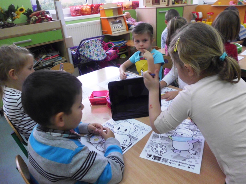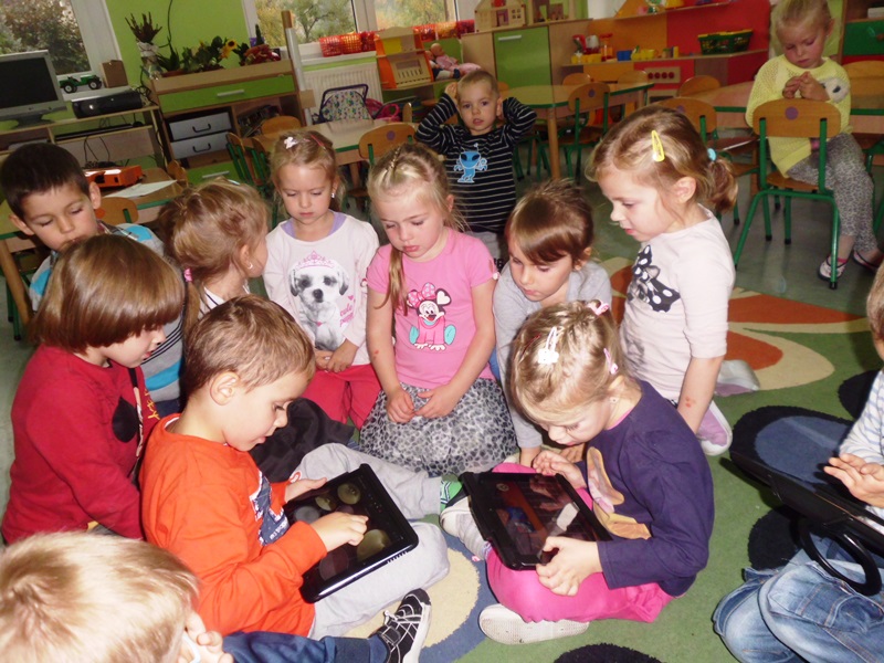 Zabawa z tabletami skupiła uwagę 18 dzieci, z którymi pracowała bibliotekarka z Jaszkowej Górnej pani Agata M., pełniąca w naszej gminnej bibliotece funkcję Master Tableta. Podczas zajęć przedszkolaki dowiedziały się o aplikacjach zainstalowanych na iPodach oraz miały okazję poznać ich możliwości. Dzieci zainteresowały Quiver i Dinozaury 4D. Aplikacje te pozwalają powołać do życia obiekty i osoby w przestrzeni trójwymiarowej, istniejącej tylko na ekranie urządzenia. I to był strzał w dziesiątkę. Pani Agata dostała zamówienia na kolejne zajęcia.
