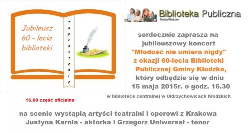 W piątek, 15 maja 2015 roku, Biblioteka Publiczna Gminy Kłodzko obchodziła jubileusz 60-lecia funkcjonowania. Dzień ten był wyjątkowy jeszcze z innych powodów. Swoje święto obchodzili bibliotekarze i biblioteki w ramach ogólnopolskiego Tygodnia Bibliotek pod hasłem „Wybieram bibliotekę”.