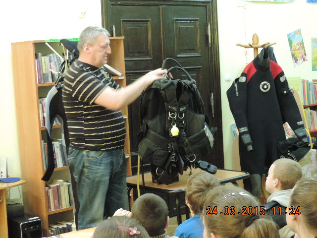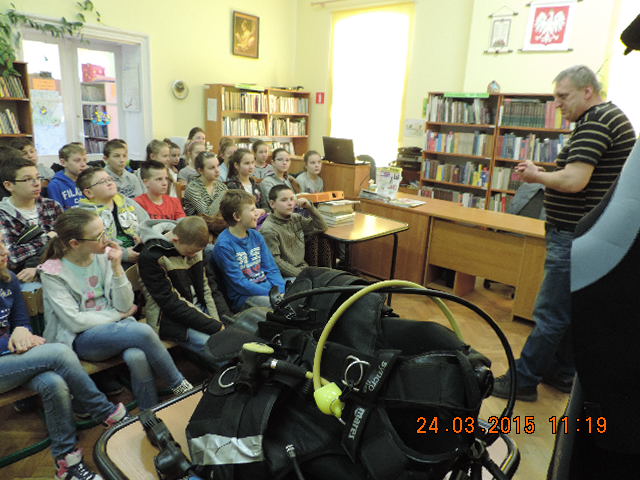 Nasz gość nurkował w wodach Adriatyku, Morzu Czerwonym, Oceanie Indyjskim- w pobliżu archipelagu Malediwy, poznał także piękno dna naszego Bałtyku i naszych jezior. Mówił o zwiedzaniu podwodnych jaskiń i raf koralowych, o spotkaniach z ciekawą fauną i florą. Szczególnie wspominał spotkania oko w oko z różnymi gatunkami rekinów. Uczniowie byli zafascynowani, słuchali z zainteresowaniem wszystkich opowieści . Z entuzjazmem zadawali profesjonalne pytania, którymi zaskoczyli pana Grzegorza. Każdy miał możliwość pooddychać przez maskę do nurkowania.