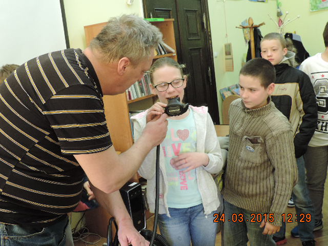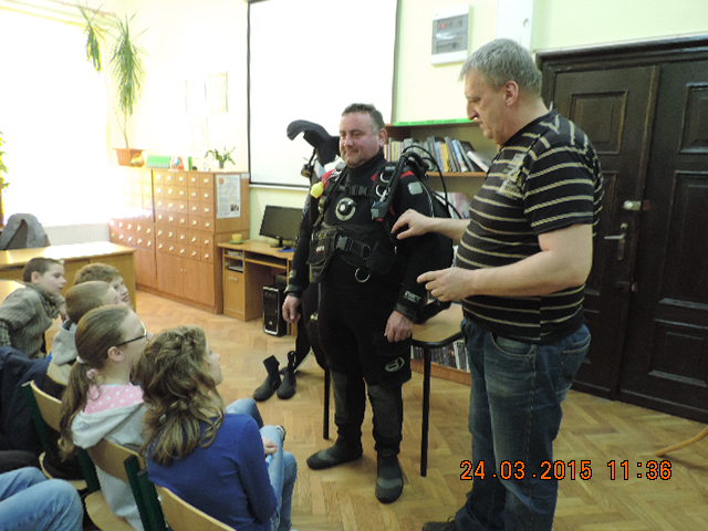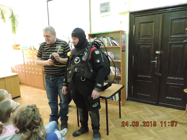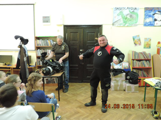 Zachęcał uczniów do zainteresowania się nurkowaniem, udzielał porad i wskazówek, jak zostać dobrym płetwonurkiem. Zaprezentował kombinezon i całe wyposażenie do nurkowania, jako „model” wystąpił Artur Szczytowski - instruktor Ośrodka Kultury Sportu i Rekreacji Gminy Kłodzko. Pan Grzegorz przedstawił projekcję filmu z podróży i nurkowania w głębinach mórz i oceanów.