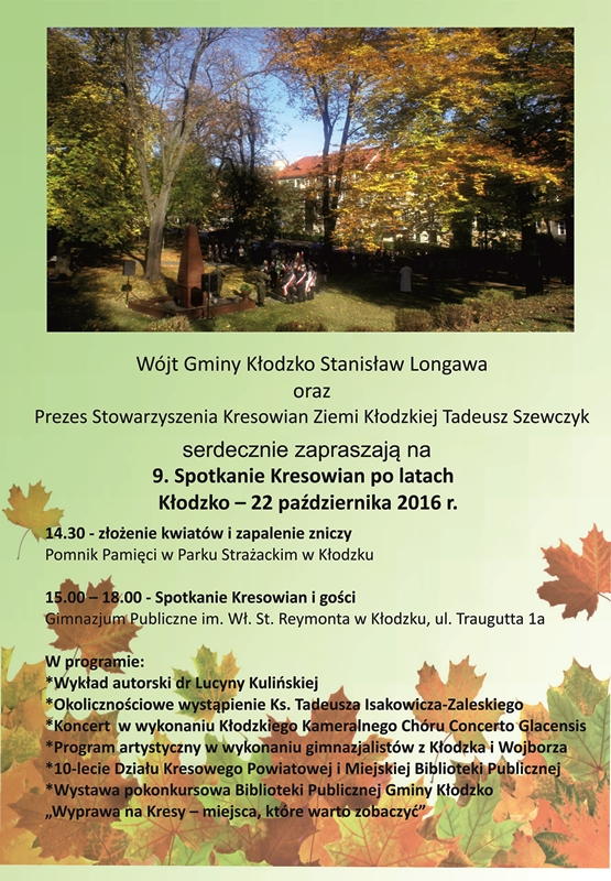9. Spotkanie Kresowian po latach w Kłodzku rozpoczęto tradycyjnie pod obeliskiem pamięci pomordowanych na Kresach Wschodnich Polaków w latach 1939-1947. W uroczystym hołdzie uczestniczyli m.in. Poseł na Sejm RP Monika Wielichowska, przewodniczący Rady Gminy Kłodzko Zbigniew Tur, zastępca wójta gminy Kłodzko Urszula Panterałka, zastępca burmistrza miasta Kłodzka Wiesław Tracz, prezes Stowarzyszenia Kresowian Ziemi Kłodzkiej Tadeusz Szewczyk, radni powiatu Kłodzkiego Piotr Marchewka i Ryszard Niebieszczański. Obecne były służby mundurowe z 22. Karpackiej Brygady Piechoty Górskiej oraz Straży Miejskiej. Także lokalne poczty sztandarowe oraz przedstawiciele stowarzyszeń kresowych z Kłodzka, Kędzierzyna Koźle, Dzierżoniowa i Nowej Rudy.