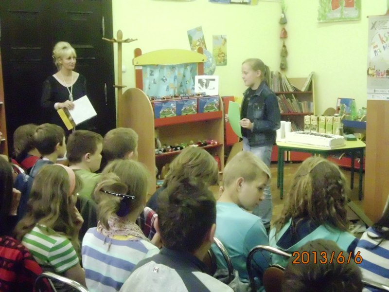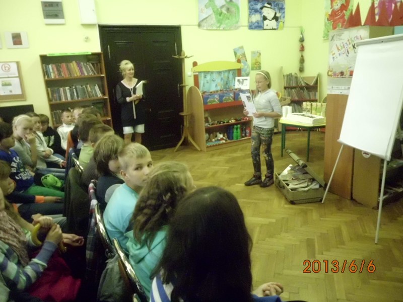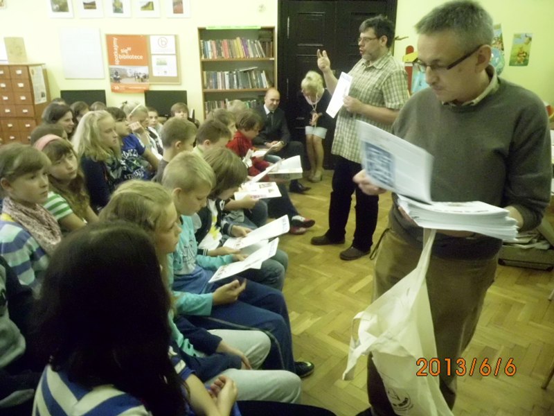 Kierownik DBP pan Jerzy Kumiega przywiózł dla każdego uczestnika spotkania gazetkę „Walizka” wraz z dodatkiem nadzwyczajnym „Kuferek”. Wyjaśnił dzieciom, o co w tym wszystkim chodzi?, czyli jaka jest idea wędrującej od dziesięciu lat po Dolnym Śląsku bibliotece.