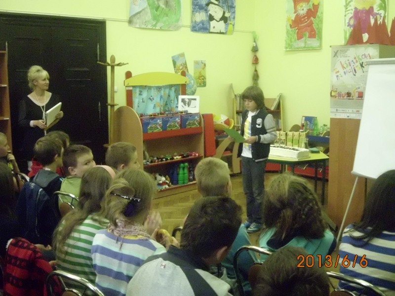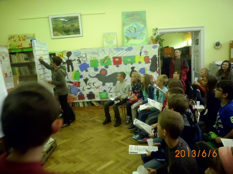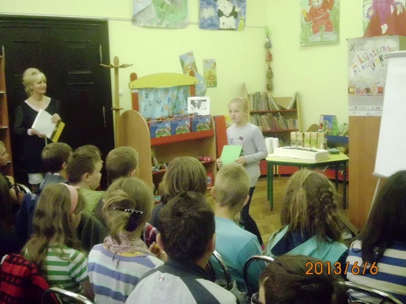 Oczywiście, nie mogło też zabraknąć prawdziwych akcentów Juliana Tuwima. I tak Martyna Dżendżera zaprezentowała się w „Okularach”. Marcel Tebinka „Pstrykał”, a Zuzanna Podwalny opowiedziała o „Spóźnionym słowiku”. Na regałach bibliotecznych była też wyeksponowana praca zbiorowa z twórczością polskiego pisarza, którą namalowano kilka dni wcześniej. Wasza bibliotekarka Małgosia Ostrowska sprawdzała wiedzę i tak powstała krzyżówka, w której swoją aktywność pokazał Kacper... Brawo!