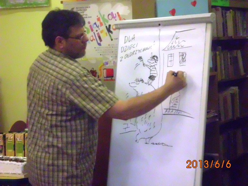 Nie zabrakło również wspaniałego kunsztu rysownika-humorysty, który zostawił swoje prace dla biblioteki, szkoły podstawowej i na fundusz stypendialny im. Grzegorza Ciechowskiego. Były też osobiste wpisy z rysunkami autora do książek zakupionych „z pierwszej ręki” oraz zaproszenie do Polskiego Radia, gdzie niebawem będzie można posłuchać książki „O czym szumi las”.