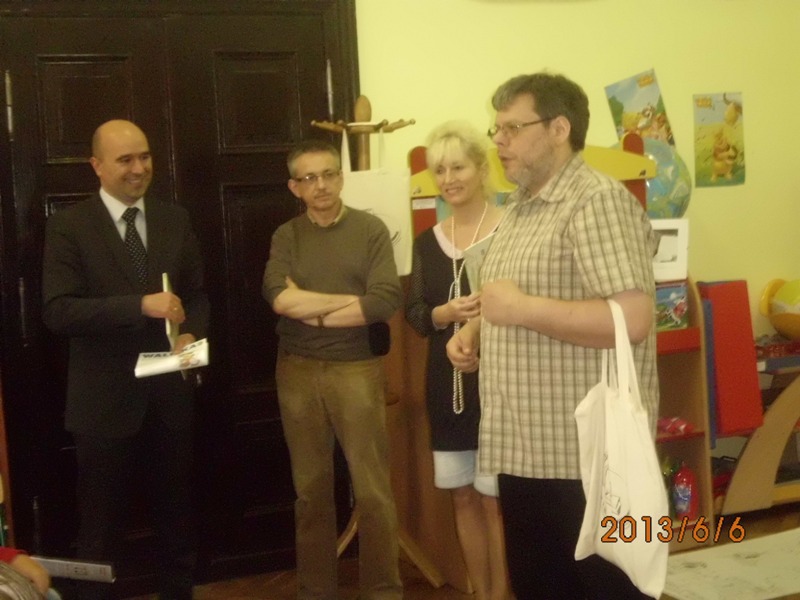 Wójt Gminy Kłodzko podziękował organizatorom za ciekawą podróż z pisarzem, wręczając panu Pawłowi pierwsze wydanie książki „Polsko-czeskie zmyślone bajeczne historie”. Bo to właśnie pan Paweł Wakuła poprowadził w roku ubiegłym we wszystkich naszych bibliotekach warsztaty ilustratorskie dla dzieci polskich i czeskich. I tak powstała ta bajka…