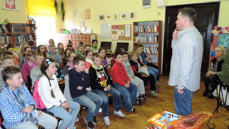 Swoje spotkanie pan Grzegorz Kasdepke rozpoczął od autoprezentacji. Przyjechał z Warszawy. Urodzony w 1972 r. w Białymstoku. Autor książek dla dzieci i młodzieży.