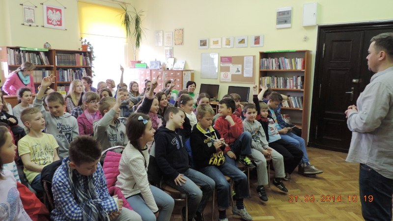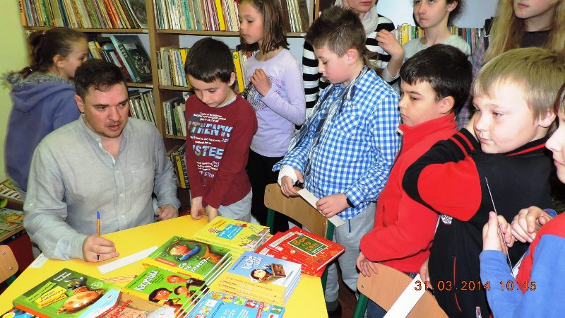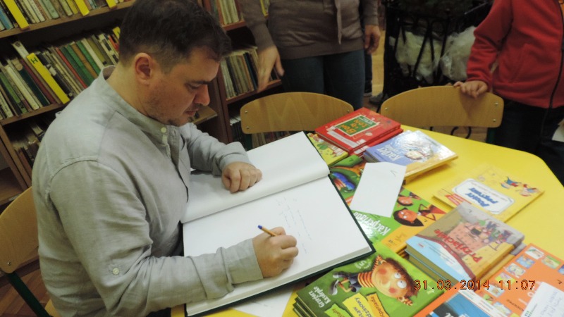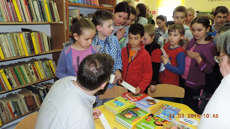 Pisarz był zainteresowany preferencjami czytelniczymi uczniów. Odpowiadał na pytania, których było od metra i ciut… A potem ustawiła się kolejka po książki, po autografy z dedykacjami i pamiątkowe fotki z pisarzem. To jeszcze nie był koniec. Ciąg dalszy nastąpił po południu, kiedy to dzieci przychodziły do biblioteki z rodzicami, aby się zapisać i wypożyczyć książki pana Grzegorza Kasdepke. I o to chodziło!