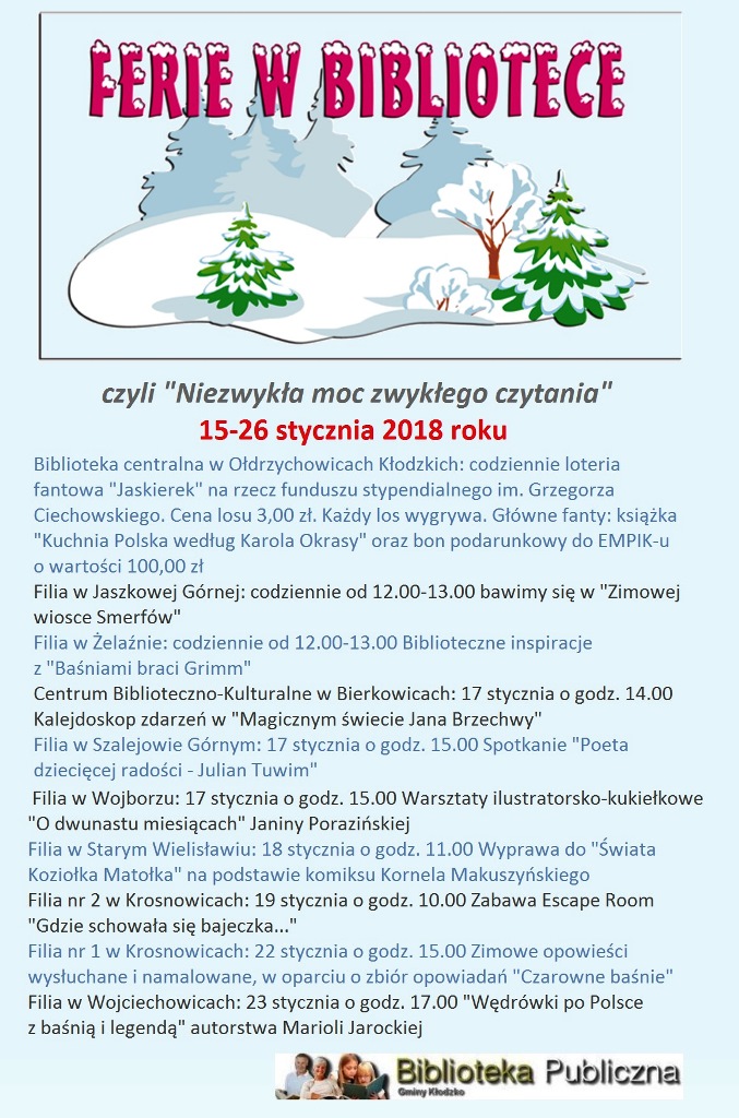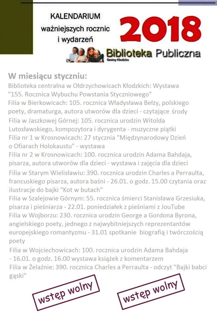 Plan działalności Biblioteki Publicznej Gminy Kłodzko na miesiąc styczeń 2018