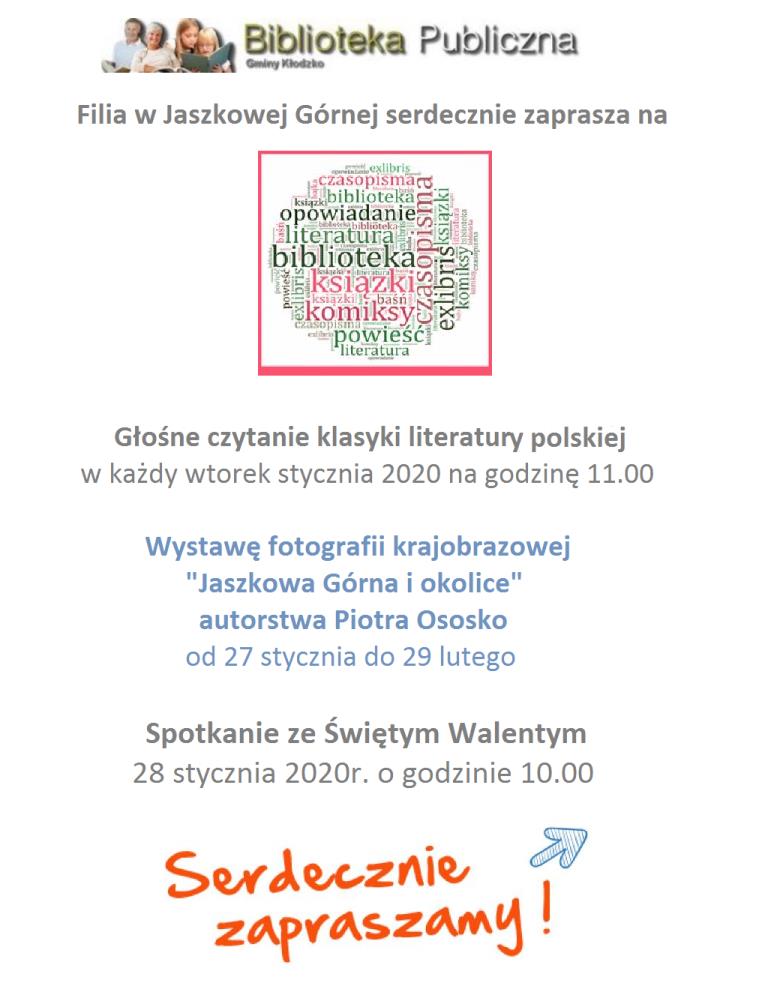 Filia w Jaszkowej Górnej: Głośne czytanie seniorom klasyki literatury polskiej - w każdy wtorek od godziny 11.00 Wystawa fotografii krajobrazowej Piotra Ososko „Jaszkowa Górna i okolice” od 27 stycznia do 29 lutego |