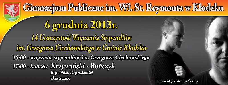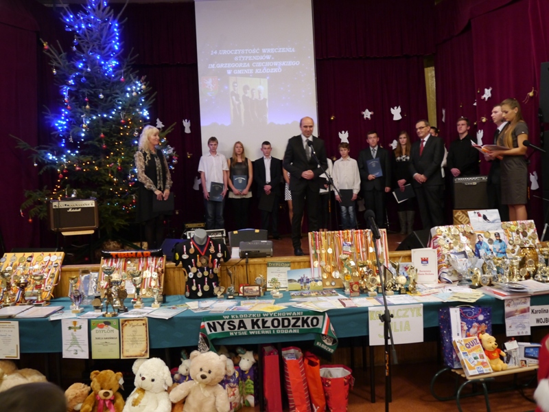 6 grudnia 2013 roku w Gimnazjum Publicznym im. Wł. St. Reymonta w Kłodzku wójt gminy Kłodzko pan Stanisław Longawa, współtwórca programu stypendialnego pan Ryszard Niebieszczański oraz przewodnicząca kapituły stypendialnej pani Mariola Huzar wręczyli certyfikaty sześciu stypendystom programu stypendialnego im. Grzegorza Ciechowskiego. Zanim to nastąpiło…