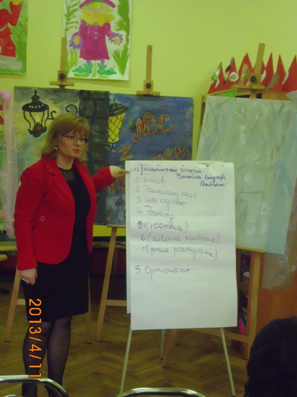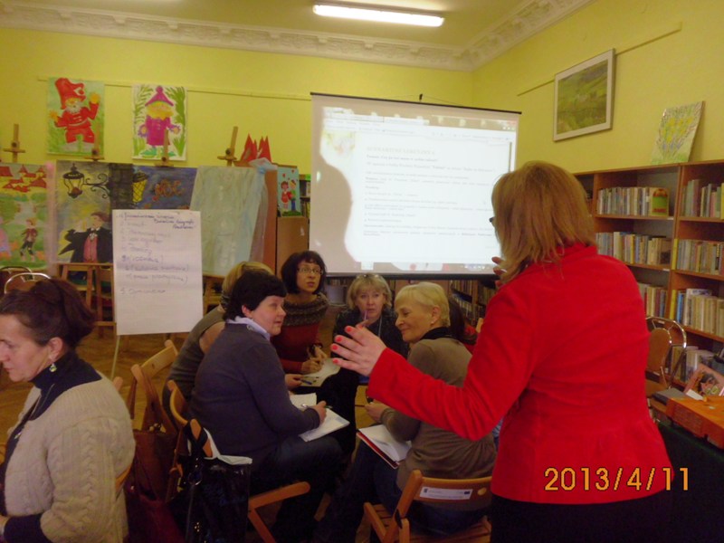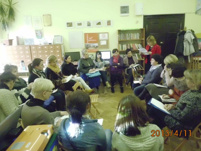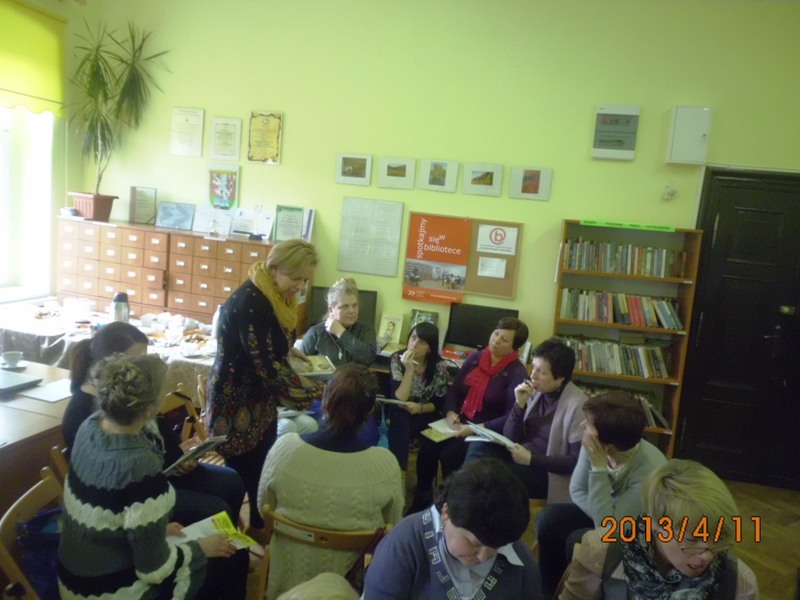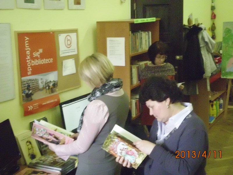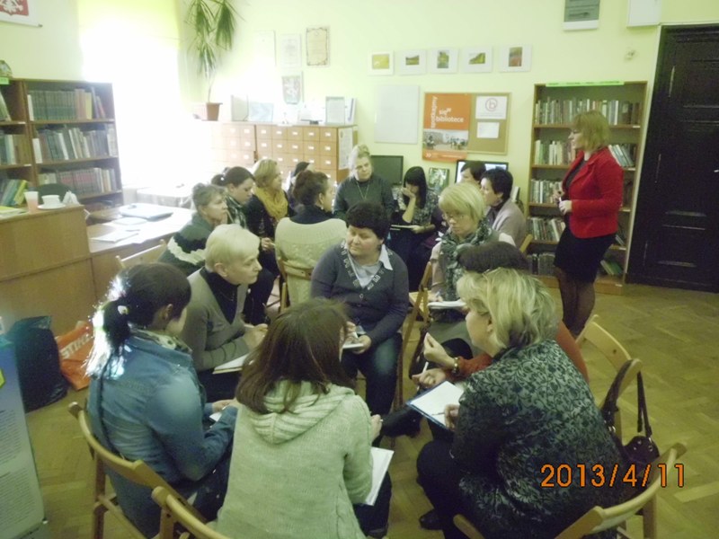 W czwartek 11 kwietnia 2013 roku odbyło się pierwsze spotkanie – warsztaty metodyczne dla bibliotek partnerskich w zakresie pisania scenariuszy bibliotecznych na podstawie baśni i twórczości dziecięcej. Warsztaty poprowadziła znana w Polsce autorka książek dla dzieci pani Wioletta Piasecka. Uczestnikami magicznego spotkania byli pracownicy Biblioteki Publicznej Gminy Kłodzko oraz jej trzech bibliotek partnerskich: Biblioteki Publicznej Miasta i Gminy w Radkowie, Gminnej Biblioteki Publicznej w Lewinie Kłodzkim oraz Biblioteki Publicznej w Ludwikowicach Kłodzkich. W warsztatach wziął również udział nauczyciel Zespołu Szkół w Wojborzu. Razem 21 osób.