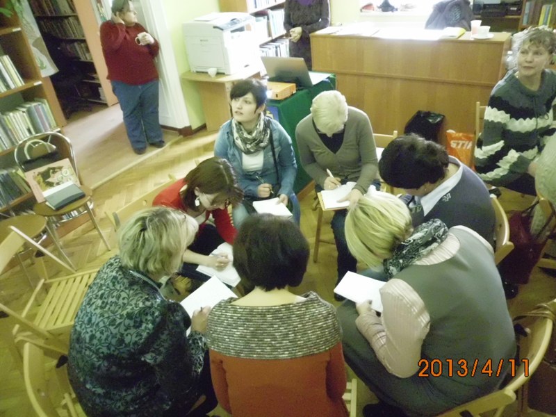 W drugiej części uczestnicy zostali zaproszeni do pracy warsztatowej. Bibliotekarze podzielili się na dwie grupy, aby uzyskać dwa nowe scenariusze, celem dokonania porównania i analiz. Był to naprawdę twórczy czas. Podczas ołdrzychowickich warsztatów wypracowano dwa ciekawe scenariusze, które będą stanowić materiał szkoleniowy do ew. wykorzystania w całej Polsce za pośrednictwem strony internetowej pisarki:
