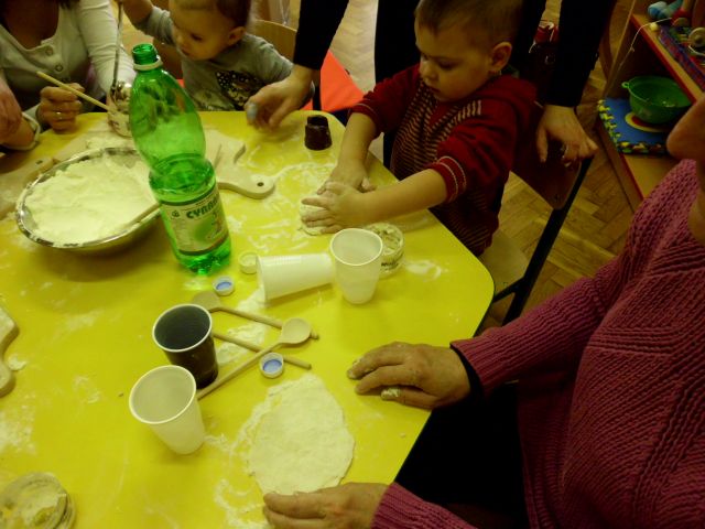 Przygotowano także stoliki do pracy. Reakcja dzieci była niesamowita. Najpierw chwila ciszy, głęboki wdech, zdziwienie?, a zachęcone przez animatorki kochane maluchy po prostu wpadły w wir pracy. Z wielkim skupieniem wybierały produkty i naczynia oraz przybory. Wtedy zaczęło się mieszanie, ważenie, sypanie, przesypywanie i wysypywanie, lepienie ciasta, podlewanie wodą i znów próba przełożenia produktów do naczyń i pojemników. Podziw wzbudzało wielkie zaangażowanie , przejęcie i energia z jaką dzieci wykonywały wszystkie czynności.