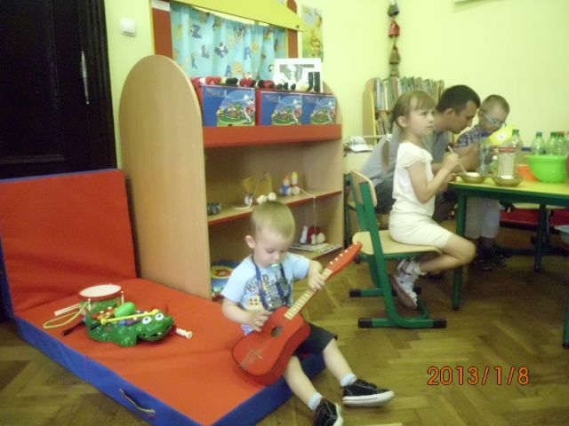 Poniższy opis dotyczy jednego z wielu spotkań, które cieszyły się dużym powodzeniem wśród uczestników. Wybrane zostało przez nas do udziału w konkursie, ponieważ wywołało najwięcej emocji i zaangażowania wśród małych bohaterów. Zajęcia prowadzone były według stałego scenariusza, który zakładał:rytuał na wejście, czyli uderzenie w gong z chochelki i pokrywki; zabawa dowolna; powitanie w kręgu polegające na uderzaniu w bębenek; przedstawieniu się i podaniu instrumentu dalej; zabawa inspirowana przez animatorów; poczęstunek; zabawa ruchowa lub dowolna; wspólne sprzątanie; pożegnanie. Zabawa inspirowana przez animatorki to główna część każdych zajęć. Tym razem polegała na zabawie produktami spożywczymi. Animatorki przygotowały kącik z naczyniami: durszlaki, miski, sitka, rondelki, drewniane łyżki, deski do krojenia, lejki oraz półki z produktami: kasza, ryż groch , fasola, mąka, kukurydza, makarony, kasza manna, mąka ziemniaczana, cukier. Wszystkie produkty znajdowały się w różnych pojemnikach: plastikowych butelkach, puszkach, pojemnikach , torebkach foliowych i papierowych.