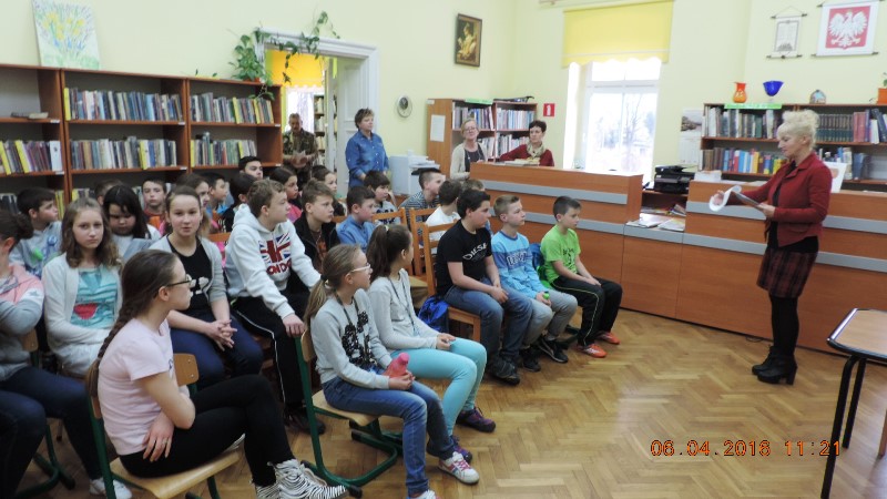 Oczekując na naszego gościa, dyrektor Biblioteki pani Mariola Huzar zaangażowała uczniów do akcji „Czytam w podróży”, którą od czterech lat popularyzuje Fundacja im. Zbigniewa Herberta. Czytaliśmy poezję Herberta z tomiku wierszy „Struna światła”. Młodym czytelnikom wręczono okazjonalne zakładki do książki o treści