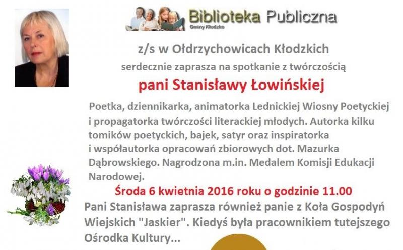6 kwietnia 2016 roku w Bibliotece Publicznej Gminy Kłodzko w Ołdrzychowicach Kłodzkich gościła poetka, dziennikarka i propagatorka twórczości literackiej młodych, pani Stanisława Łowińska. Przyjechała do nas z Poznania. Na spotkanie przybyli uczniowie z miejscowej szkoły podstawowej oraz szefowa zespołu śpiewaczego „Jaskier” pani Halina Bałys.