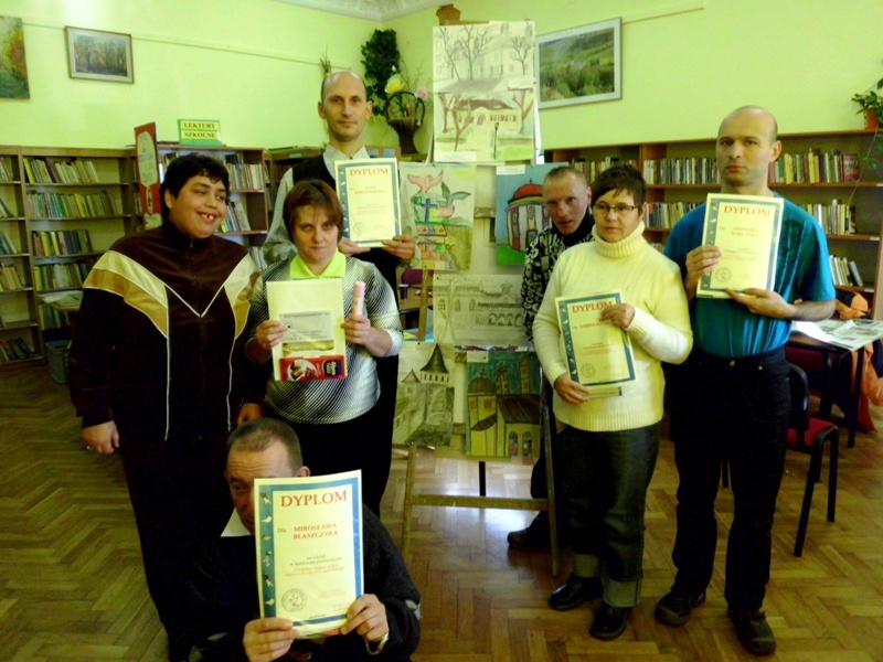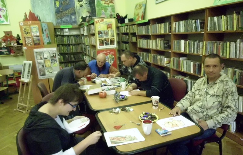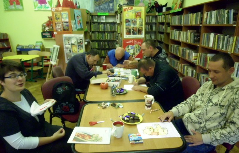 Na zajęcia z biblioterapii przyjeżdżali do nas mieszkańcy Domu Pomocy Społecznej z Podzamka. Lubią odwiedzać naszą książnicę, bo czeka na nich miła atmosfera i niespodzianki. Czytamy książki, odwiedzamy świat Internetu, malujemy i interpretujemy na papierze własne historie. A na koniec pijemy kawkę i herbatkę. Zajęcia zapoczątkowano już w latach dziewięćdziesiątych i są prowadzone regularnie.