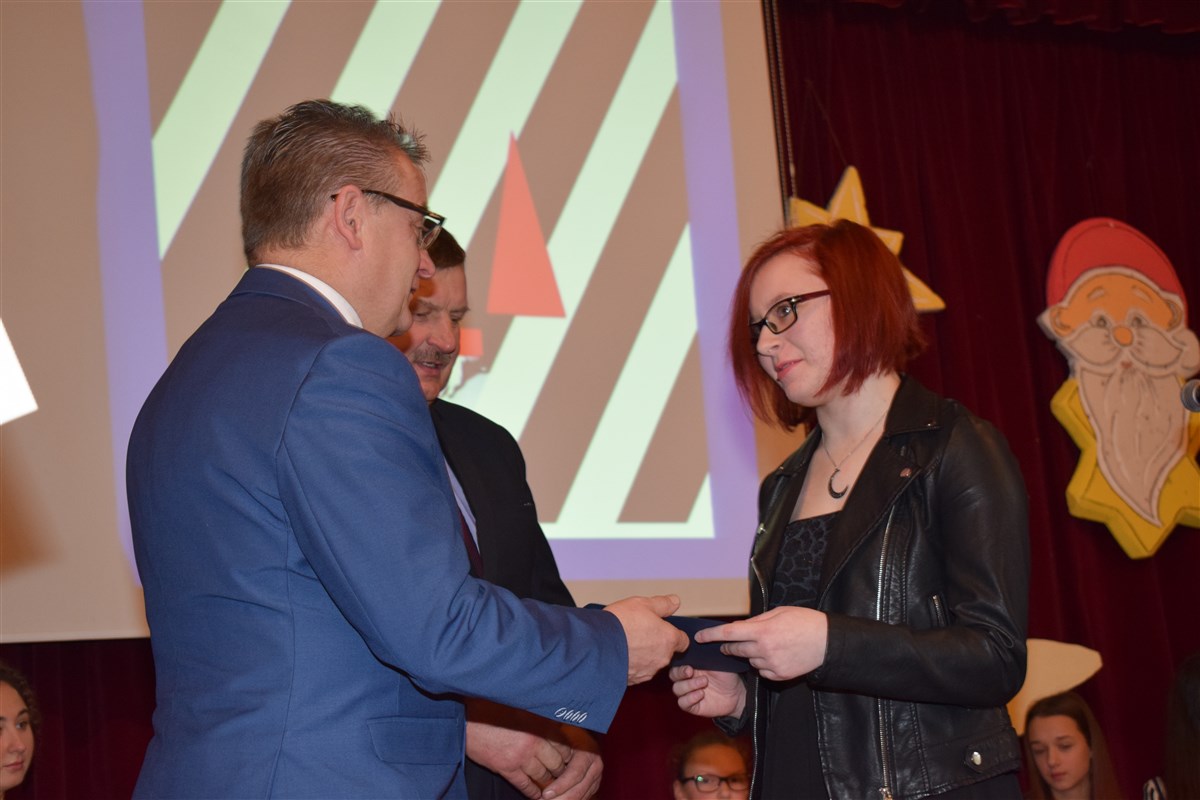 Sekretarz Gminy Kłodzko Bożena Simlat dla Martyny Waszczyk z Ołdrzychowic Kłodzkich, lat 13, uczennica klasy siódmej Szkoły Podstawowej w Ołdrzychowicach Kłodzkich, za osiągnięcia sportowe – 200,00 zł