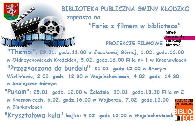 "Ferie z filmem w bibliotece" to akcja Centrum Edukacji Obywatelskiej i Stowarzyszenia Nowe Horyzonty. W ramach projektu biblioteki mogły wypożyczyć filmy pochodzące ze zbiorów edukacyjnych programu "Jeden Świat – kluby filmowe" oraz programu dystrybucji Stowarzyszenia Nowe Horyzonty. Biblioteka Publiczna Gminy Kłodzko również bierze udział w tym ciekawym projekcie i zaprasza na 10 projekcji, po jednej w każdej bibliotece. Jest to wyjątkowa okazja dla uczniów szkół podstawowych, gimnazjalistów i licealistów do rozwijania filmowych pasji oraz dyskusji na ciekawe tematy i problemy społeczne.