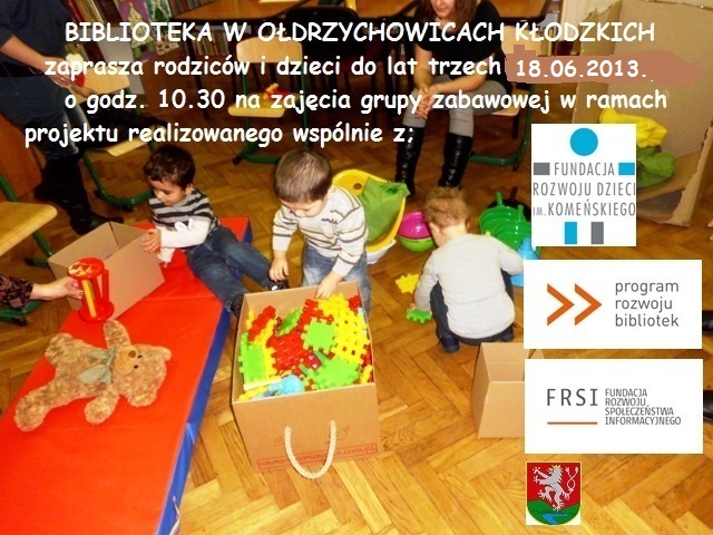 W styczniu tego roku w bibliotece centralnej w Ołdrzychowicach Kłodzkich powstała grupa zabawowa – w ramach projektu realizowanego przez Fundację im. Jana Amosa Komeńskiego „Biblioteczne zajęcia dla dzieci i rodziców – edycja druga". W tym celu zaaranżowane zostało wyjątkowe miejsce edukacyjne, które sprawiło, że bibliotekę chętnie odwiedzają małe dzieci w wieku do trzech lat oraz ich rodzice.