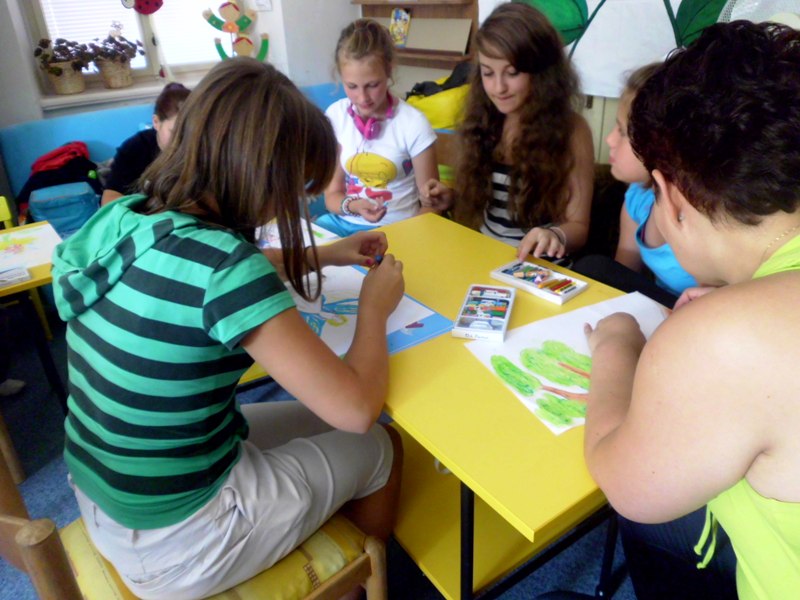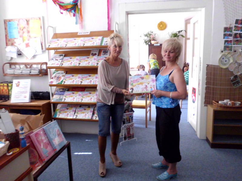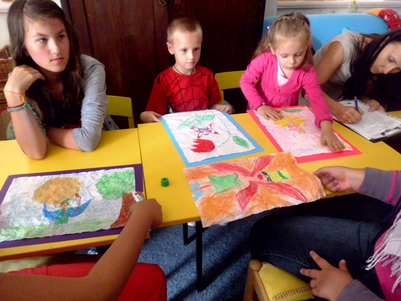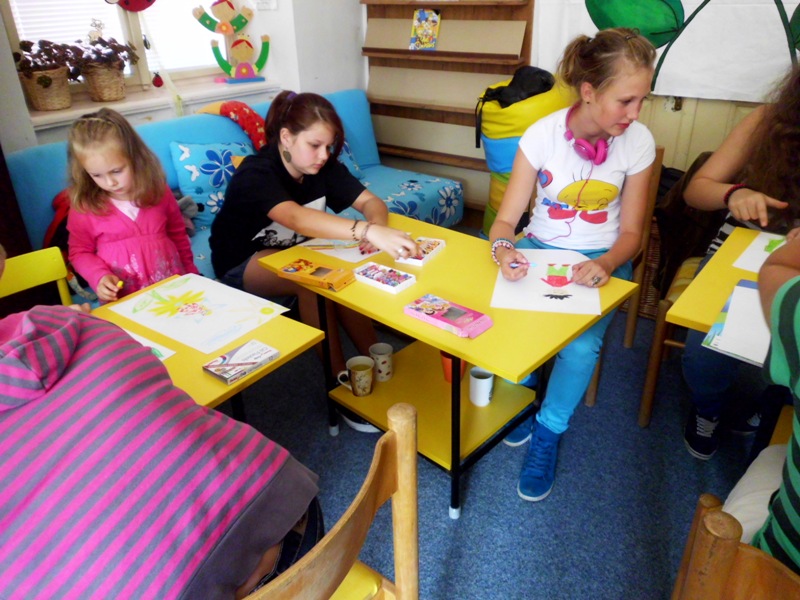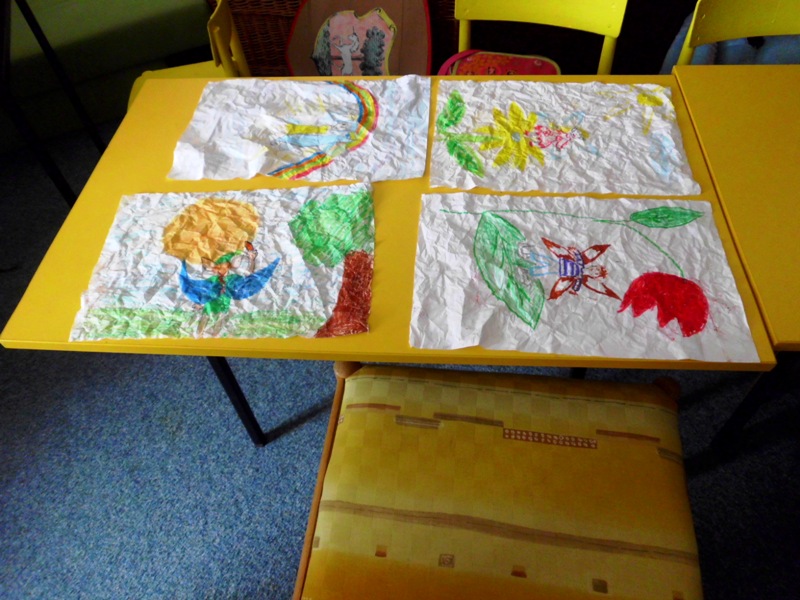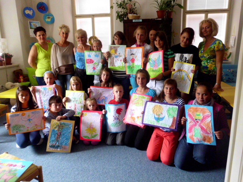 Warsztatom towarzyszyło wiele emocji, bo najpierw należało namalować specjalnymi woskowymi kredkami ELFA, według własnej fantazji. Swoim pociechom z Polski pomagały mamy, które przyjechały do czeskiej książnicy z „czystej ciekawości”. Potem okazało się, że wypieszczone kolorami prace należy zagnieść w kulkę. Zdziwione dzieciaczki nie mogły uwierzyć, że ich praca pójdzie na zmarnowanie. Z dużym ociąganiem wykonały polecenie pani Romy. Czekając w kolejce do wodnej kąpieli gorączkowo rozprawiały o tym, czym się to wszystko zakończy. Zmoczone pracy należało w miarę możliwości rozprostować i nakleić na kolorowych podkładach. Po ich wyschnięciu okazało się, że powstały same dzieła sztuki. Autorzy nie chcieli się z nimi rozstawać, bo okazało się, iż trafią na wystawę do Urzędu Gminy w Kłodzku. Po wykorzystaniu wrócą do ich autorów w Starym Wielisławiu, Jaszkowej Górnej, Bierkowicach i Wojborzu.