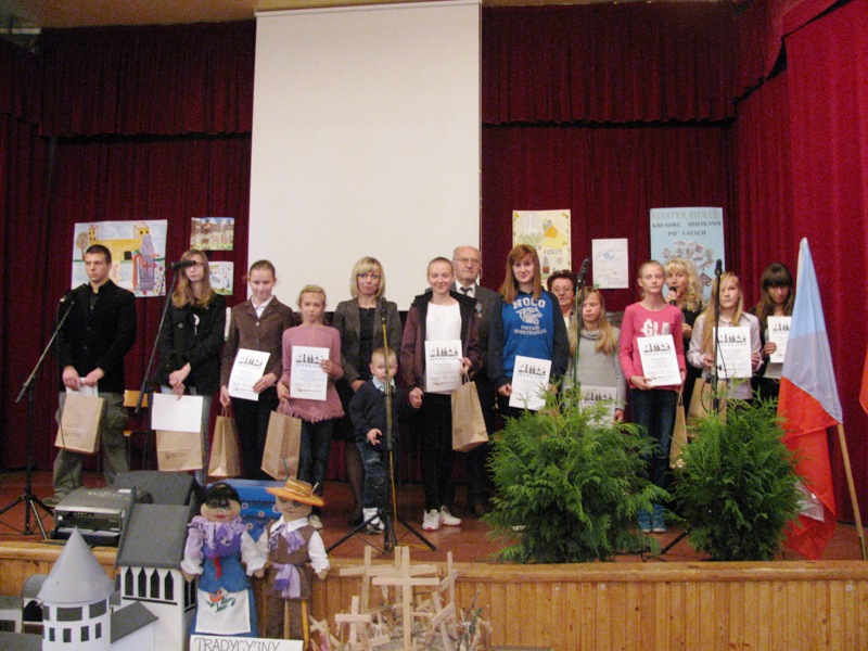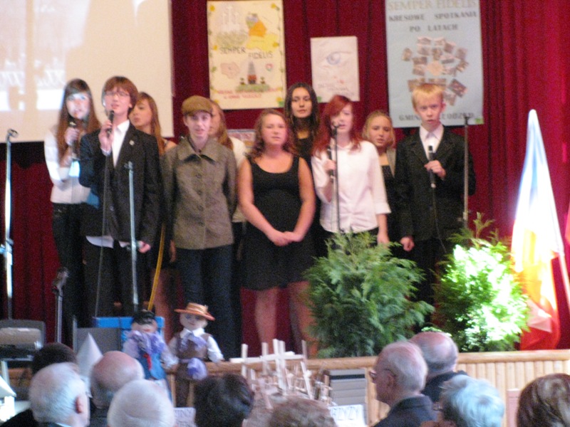 Na scenie zagościli uczniowie miejscowego gimnazjum w montażu słowno-muzycznym pt. „Śladami kresowych opowieści” w reżyserii nauczycieli języka polskiego, pań Elżbiety Myślińskiej i Beaty Smolarek. Refleksyjną poezję autorstwa Kresowian przeplatały lwowskie piosenki w wykonaniu chóru "batiarów" oraz przezabawny dialog Szczepka i Tońka, gwiazd Lwowskiej Fali. Utalentowane aktorsko uczennice Anastazja Ostopinka i Angelika Pawlikowska, w świetnie dobranej charakteryzacji i kostiumach, tchnęły nowego ducha w rozmowę o obyczajach karnawałowych sprzed II wojny światowej. Wspaniały popis umiejętności wokalnych Oliwii Łuszczyńskiej, uczennicy drugiej klasy, spiął niczym klamra występ gimnazjalistów. Niejedna łza pojawiła się pod powieką starszego pokolenia w chwili, gdy Konstanty Łukasiewicz zagrał na trąbce "Ciszę".