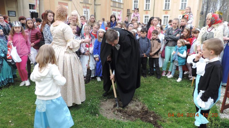 W pałacowej bramie wszystkie dzieci i gości powitali pani Mariola Huzar – dyrektor Biblioteki, w roli księżnej ze starej baśni, pani Bogusława Kochmańska – właścicielka pałacu, w roli hrabiny oraz pan Krzysztof Matysiak – dyrektor OKSiR, w roli Hansa Chrystiana Andersena