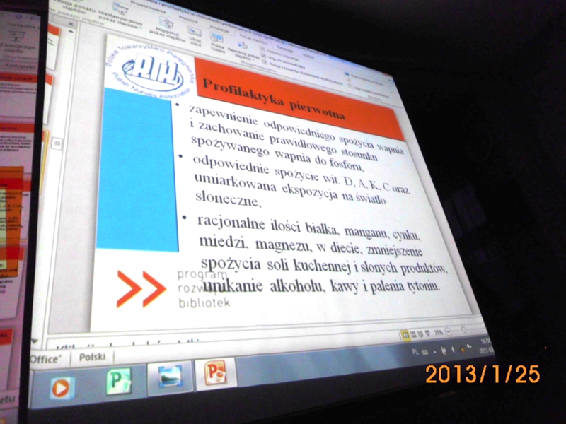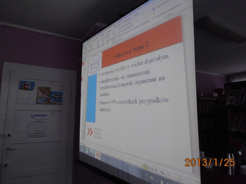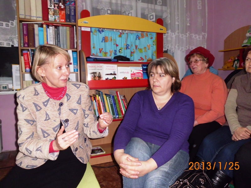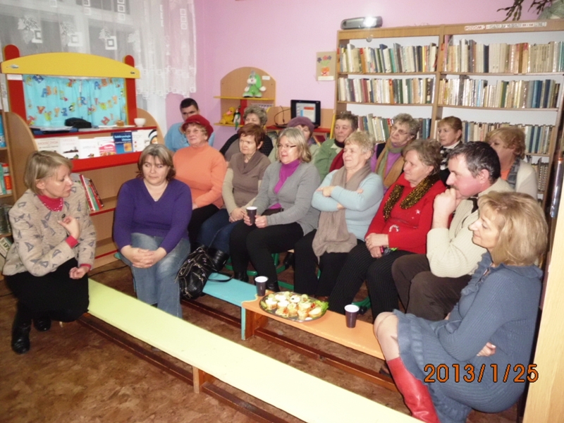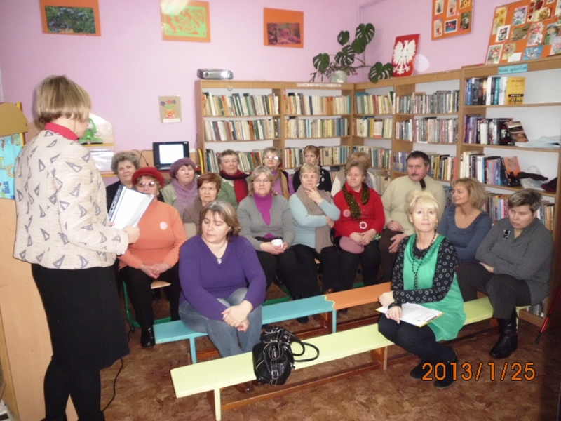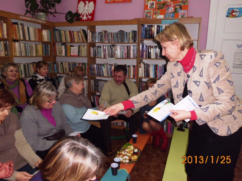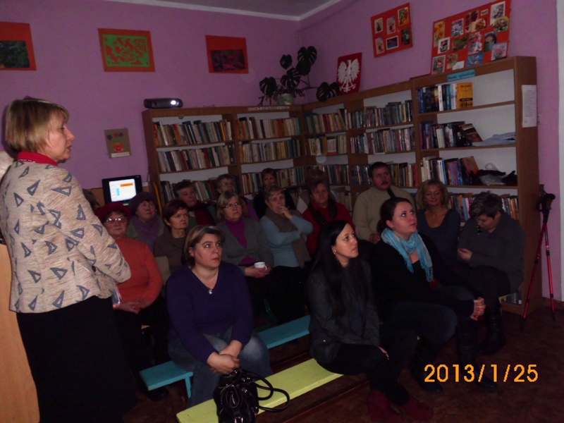 Podczas prelekcji ogłosiła nabór chętnych do bibliotecznej sekcji nordic walking - na zdrowie, dla kondycji i przeciw otyłości. Raz na kwartał będzie zapraszała specjalistów i osoby posiadające wiedzę z zakresu profilaktyki zdrowia, aby odpowiednio stymulować edukację lokalnej społeczności. Wśród uczestników rozdysponowano torby ekologiczne, notesy, długopisy oraz broszury dot. profilaktyki zdrowotnej, w tym książeczki pomiarów ciśnienia tętniczego przekazane w ramach projektu.