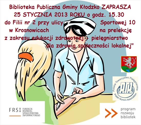 Biblioteka Publiczna Gminy Kłodzko jeszcze w ubiegłym roku wystartowała w konkursie „organizacje pozarządowe bibliotekom”. Jednym z efektów jest projekt „edukacja zdrowotna w bibliotece – pielęgniarstwo dla zdrowia społeczności lokalnej” realizowany przez Polskie Towarzystwo Pielęgniarskie w ramach ogólnopolskiego Programu Rozwoju Bibliotek.