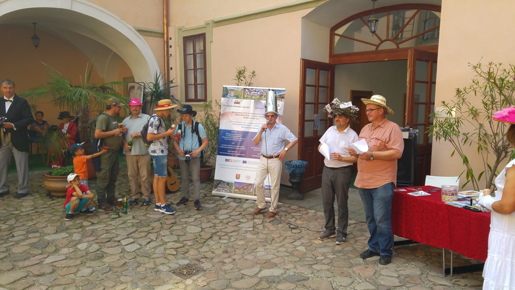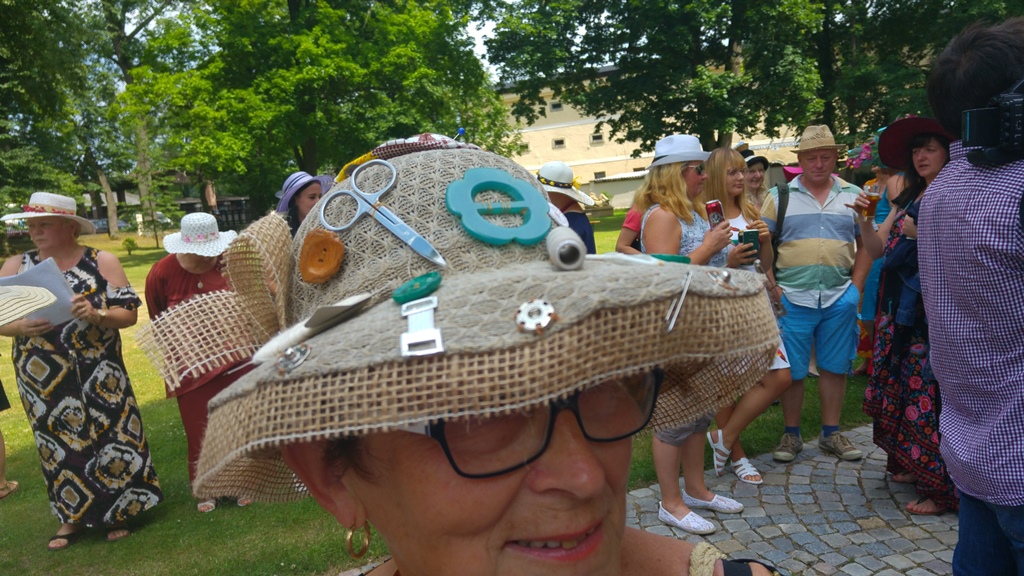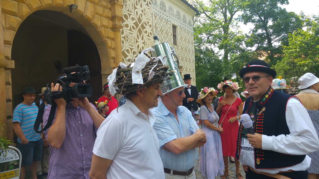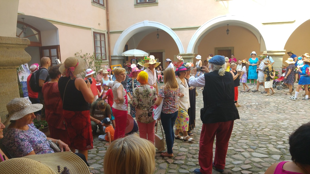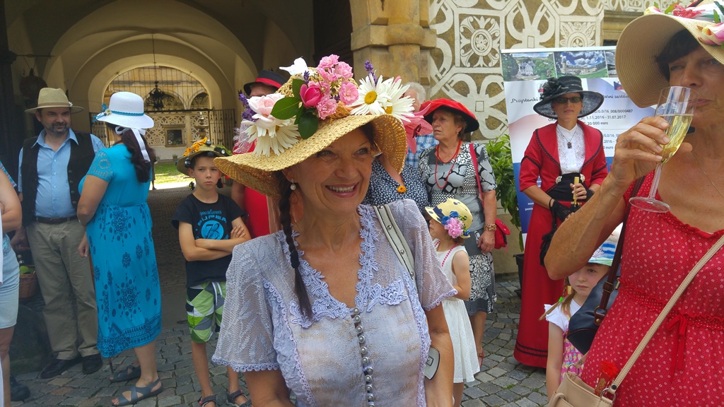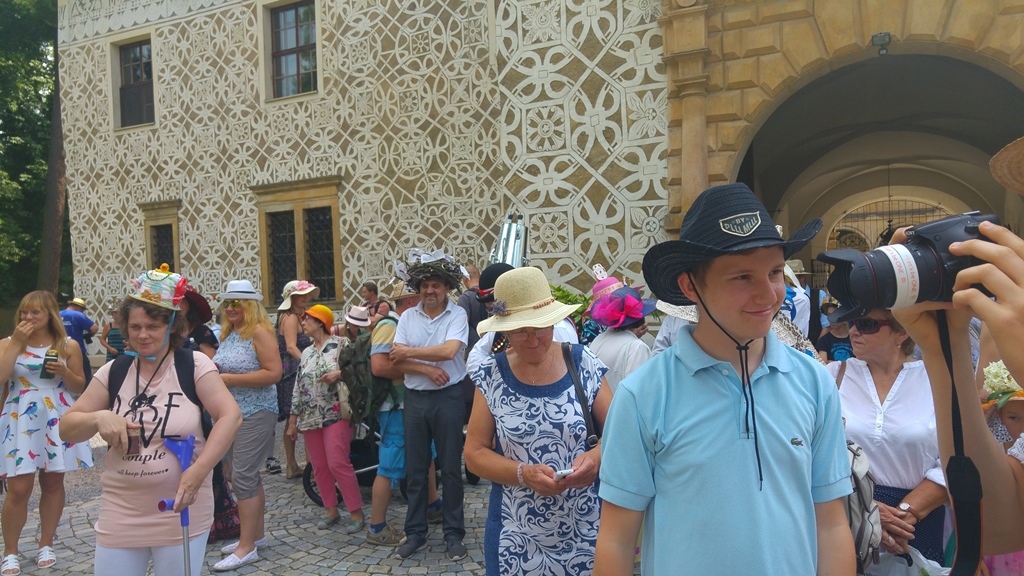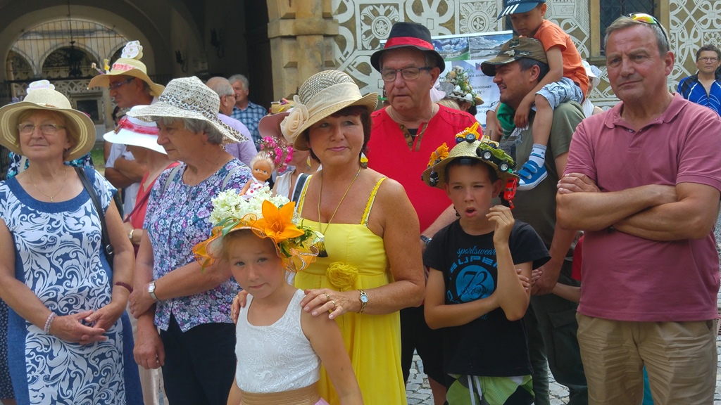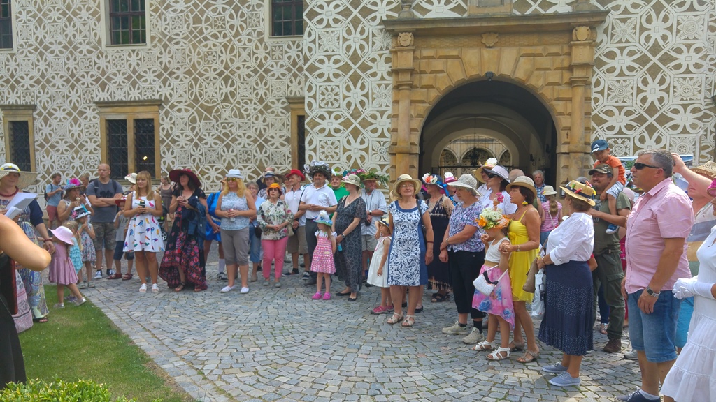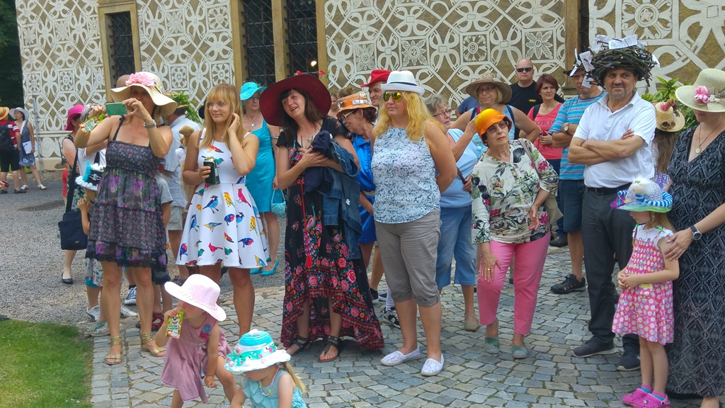 Po dotarciu na dziedziniec zamku w Potštejn, powitali nas jego właściciele państwo Nováček. Tutaj, odbył się pokaz kapeluszy. Na wybiegu pokazali się wszyscy, którzy chcieli wziąć udział w konkursie na najbardziej pomysłowe nakrycia głowy. Najpierw dzieci, potem uczestnicy z Polski, a potem obywatele z Czech. Z wielką przyjemnością ogłaszamy, że na podium polskim stanęły: