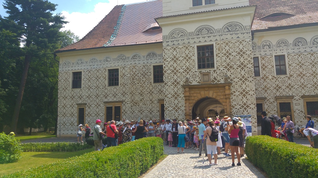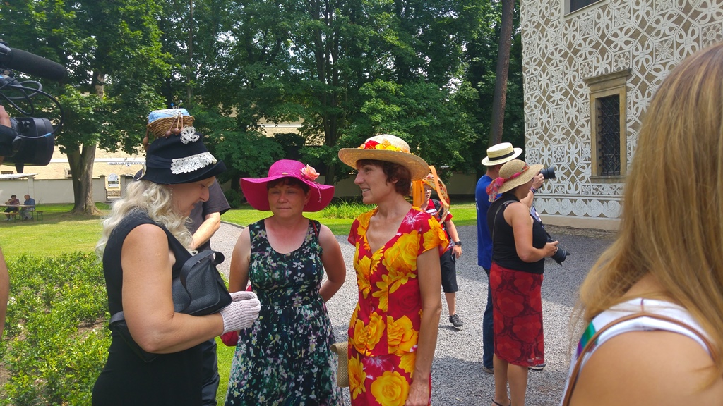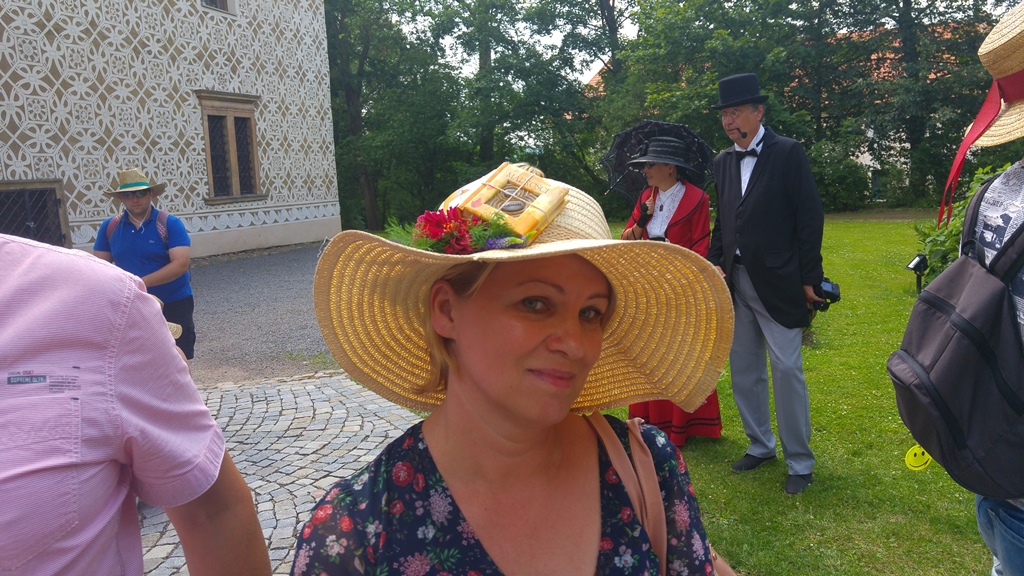 Po drodze, zatrzymaliśmy się w zabytkowym domu w obec Zamĕl, w którym prawdopodobnie kiedyś tańczył znany król Karol IV. Obejrzeliśmy pokaz średniowiecznych tańców i rzucaliśmy kapeluszami do celu… Kto trafił, ten cieszył się…. Bawiliśmy się tak dobrze, że za rok chcemy pojechać ponownie i wykazać się nietypowymi pomysłami na nakrycia głowy…
