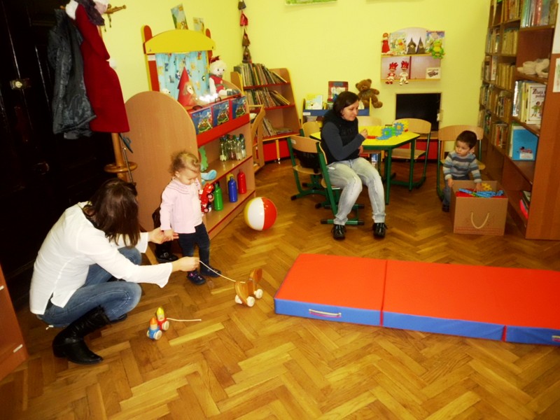 Po krótkiej przerwie na poczęstunek dzieci wykorzystały zabawki z zestawu nr 4 „Biblioteczki dla najmłodszych”. Największym powodzeniem cieszyła się zabawka do ciągnięcia ”dwa gobliny”. Na zakończenie wszyscy uczestnicy pożegnali się w kręgu tradycyjnym ”przybij piątkę”.