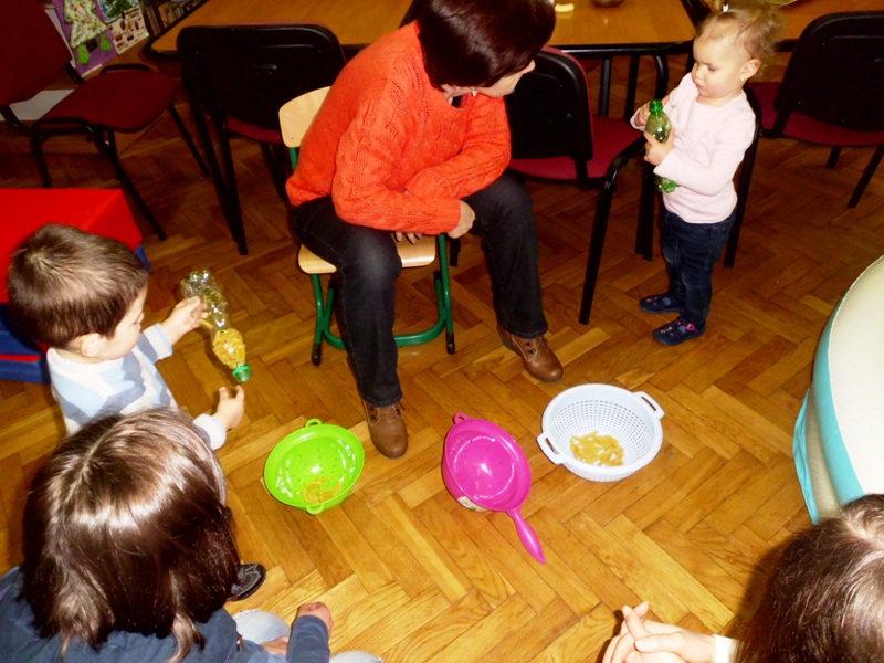 Zajęcia rozpoczęły się zabawą integracyjną z samochodzikiem. Dzieci poznawały zawartość plastikowych butelek wypełnionych fasolą, grochem, makaronem, ryżem. Poprzez potrząsanie, otwieranie i przesypywanie rozróżniały odgłosy, kształty i ciężar poszczególnych materiałów.