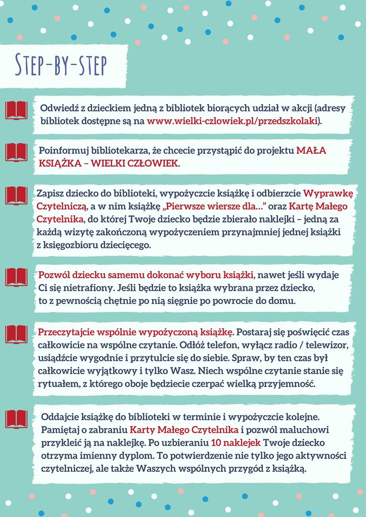 Każdy trzylatek, który przyjdzie do jednej z 3 tysięcy bibliotek biorących udział w projekcie, otrzyma w prezencie Wyprawkę Czytelniczą, a w niej książkę „Pierwsze wiersze dla…”, czyli zbiór wierszy dla dzieci autorstwa wybitnych polskich poetów, pięknie zilustrowanych przez Ewę Kozyrę-Pawlak i Pawła Pawlaka, broszurę dla rodziców „Książką połączeni, czyli o roli czytania w życiu dziecka”, która przypomina o korzyściach wynikających z czytania, oraz Karta Małego Czytelnika do zbierania naklejek.